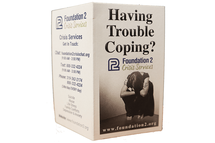 We are excited that you want to help us share about mental health care, suicide prevention and Foundation 2 Crisis Services. We offer Having Trouble Coping Cards at no cost for your use at work, school, in the community, etc. If you’d like additional marketing materials, please contact us at 319-362-1170.